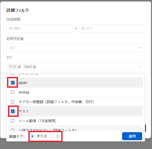 挙動:タグAとタグBのチェックをオンにしてフィルタリングした場合、タグA、タグBいずれも付与されている名刺のみ表示されます。